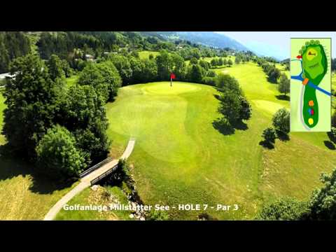 Par 3, Grün liegt auf einer Anhöhe, 1-2 Schläger mehr sind zu empfehlen. Rechts vom Grün fällt ein Hang steil ab, links gibt es ein Wasseshindernis, terrassiertes Grün.